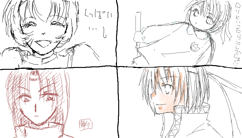 こよんが気に入らなくなったので、描き直したワタクシ。皆様も、着々と色々なモノにチャレンジされている御様子っ(笑)誰かが弱音を吐くと、「頑張って!」と応援が飛びます、容赦なっ……げふんげふんっ(笑)有り難いですっ! 私は手を伸ばした棚の上に「まるごと」があったので、パラパラとページを巡って、「お姉ちゃん」に挑戦…した筈がっ、玉砕の感じ…っ。この後、自分の画が気に入らずに消し…笠を被ったタヌキを描き掛けて消し(理由は、御出になっていた方々のみ知っていますが)、次に魚人(コルセリア祖父)を描いて皆様を笑わす…(?)事に成功っ!その間、皆様が色々描いていたモノについては、全てログを取り損ねまし…たっ(涙)