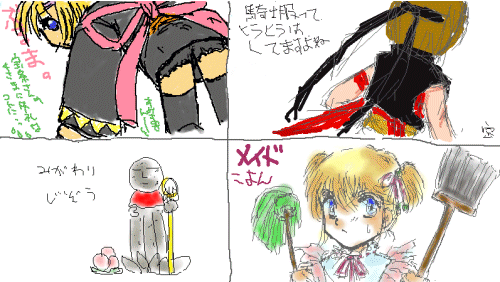 何と云いますかっ、私のこよんは背中で語っている宝●さんの女王騎士4主に大変失礼ですねっ…(笑)そして、ブ●マが愛らしい当家のこよん女王騎士服で描いて下さったk●kuさん…グッジョブっ!